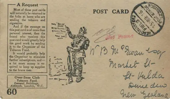 Tom Cummings to W B McEwan, Dunedin. Postcard. London: Over-seas Club Tobacco Fund, [1915]