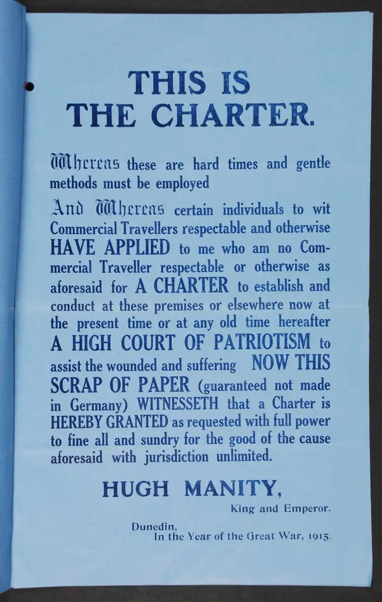 Court of Patriotism High and Full Charter. [Dunedin: New Zealand Commercial Travellers’ and Warehousemen’s Association?], 1915