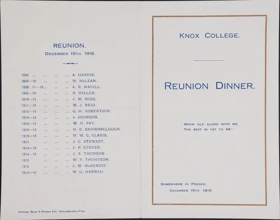 Knox College Reunion Dinner. Toast List. France, 1916 Knox College Reunion Dinner. Toast List. France, 1916 Open image in new window