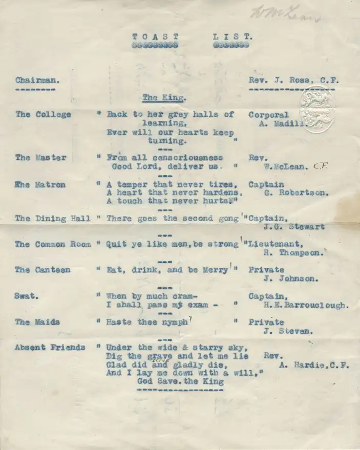 Knox College Reunion Dinner. Toast List, Signed Draft Copy. 1916 Knox College Reunion Dinner. Toast List, Signed Draft Copy. 1916 Open image in new window