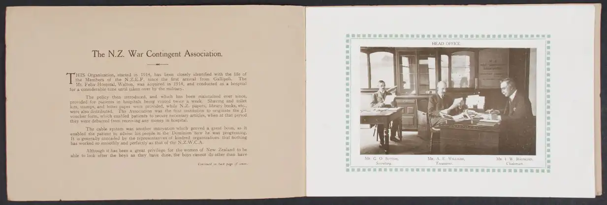 The N. Z. War Contingent Association was formed in 1914 after N. Z. High Commissioner in London, Thomas MacKenzie, called a meeting about “comforts” for the troops.