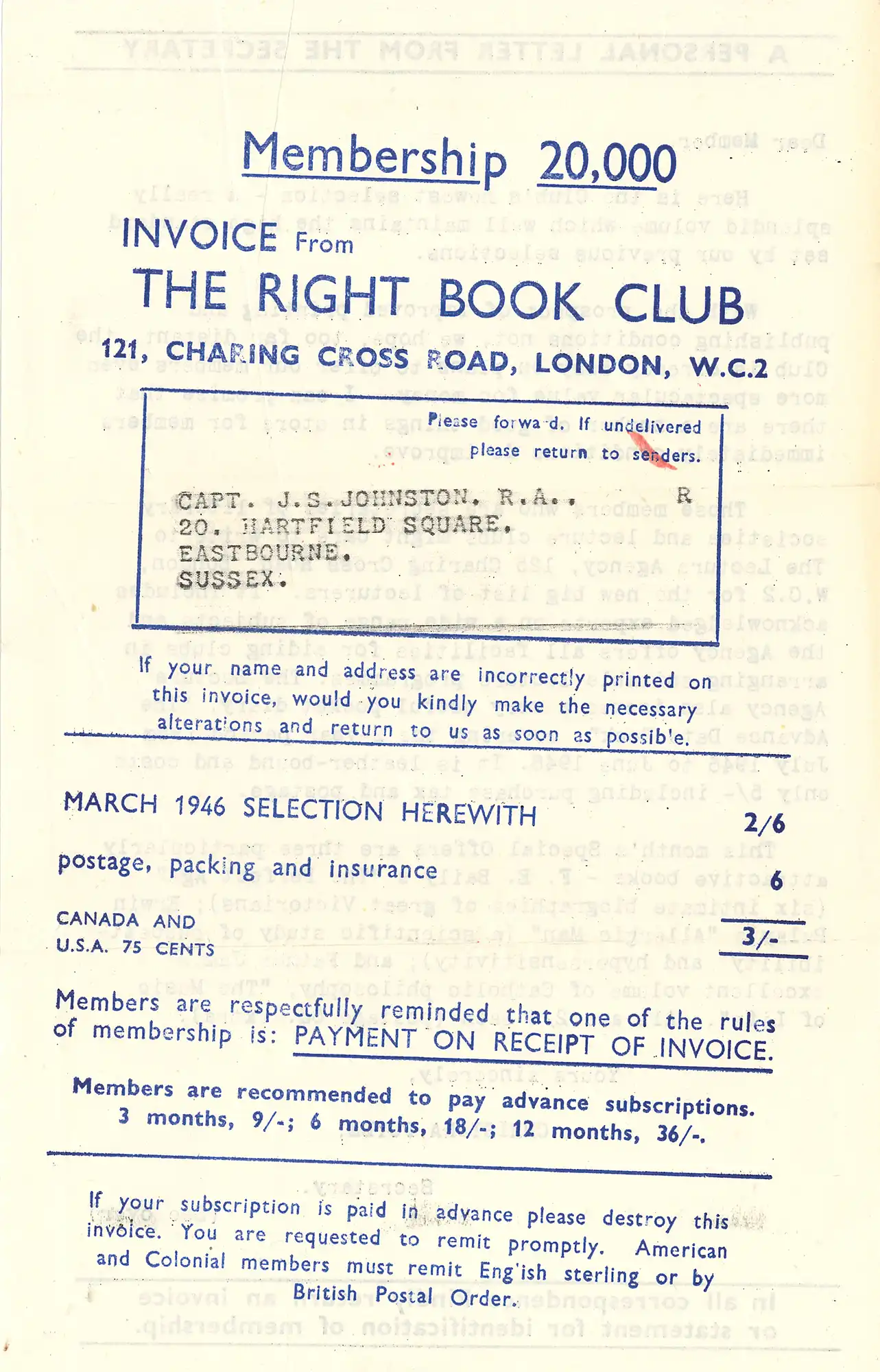 ‘A personal letter from the secretary’ leaflet, 1946. (Rear)