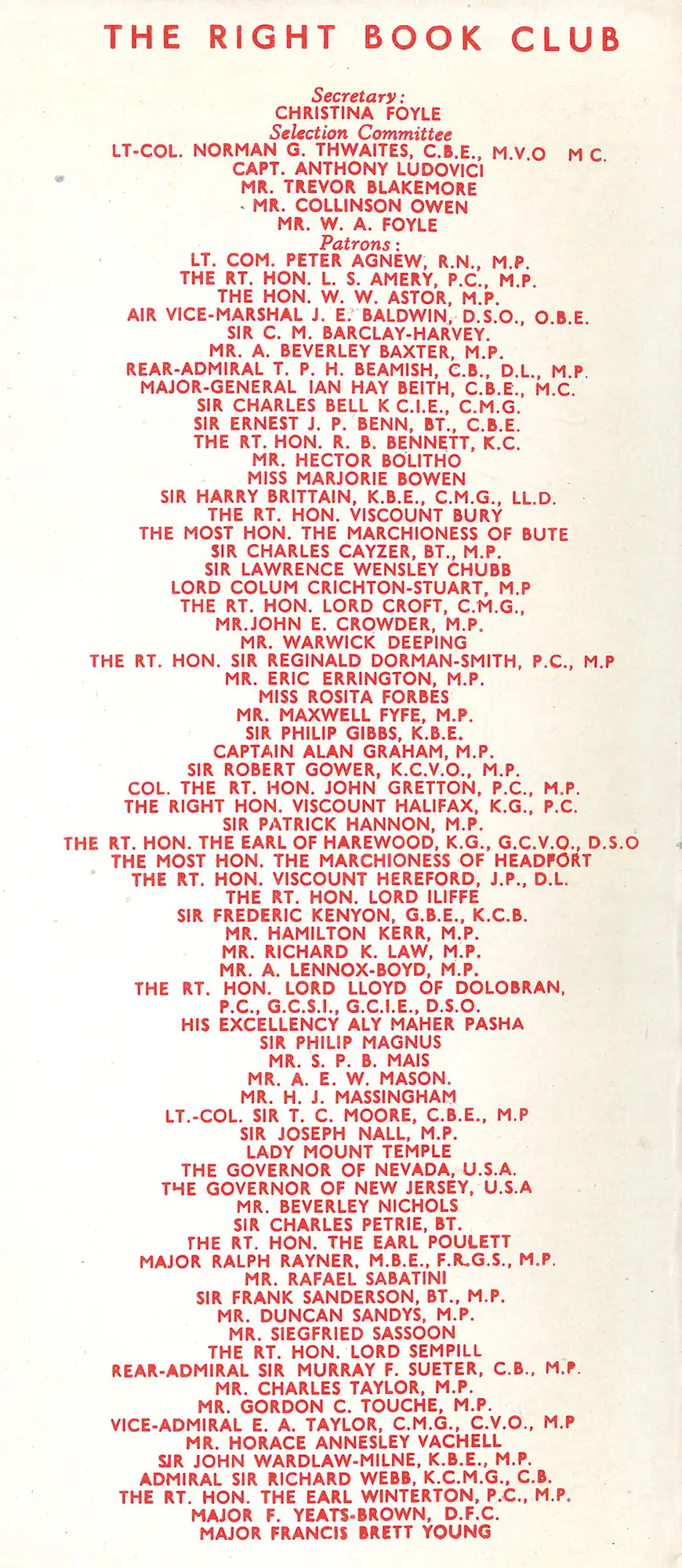 It cost prospective members nothing to belong to the RBC. However, a member’s sole responsibility was to agree to accept the monthly choice of the ‘Right’ Book Club for a minimum period of four months, to pay for same on receipt (2s 6d), and to give not less than four weeks’ notice of termination of membership. In 1946, Captain Johnston of Eastbourne, Sussex, received his ‘Personal Letter’ from Christina Foyle, where she informed him of three ‘Special Offers’, which included F. E. Baily’s The perfect age, a work that carried ‘six intimate biographies of great Victorians’. Like Gollancz, she was promotion personified: promising good things for members and pushing the RBC lecture series.