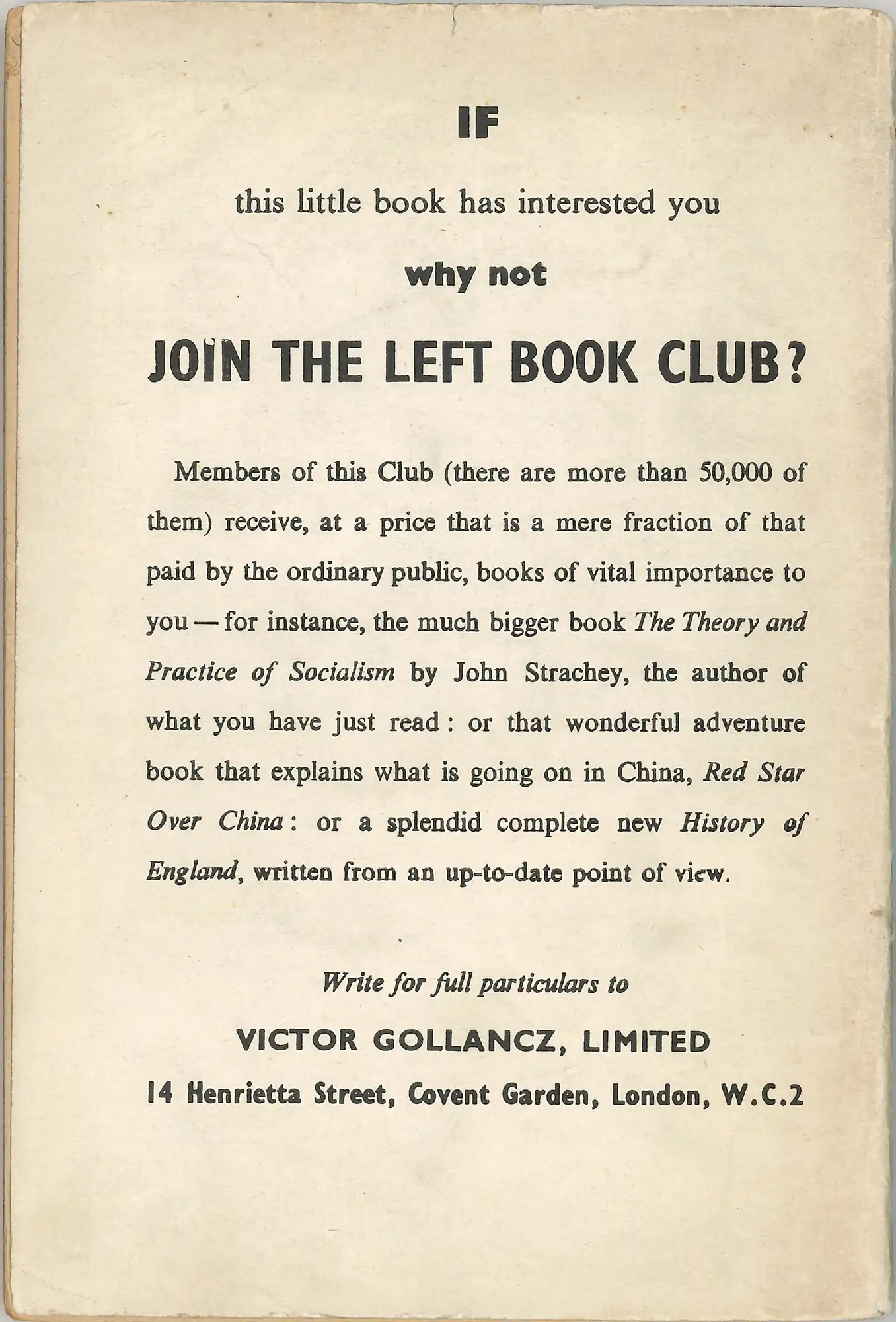 First published on 9 May 1938, this Strachey classic, priced at two-pence and with its eye-catching cover design, sold 100,000 copies. By June it had been reprinted twice, a total print run of 200,000. One contemporary critic felt the book delivered what it had promised: ‘What causes unemployment?’ Capitalism. ‘What causes war?’ Capitalism. ‘What causes boom and slumps?’. Capitalism. And so on. The back cover contains the usual Gollancz puff: ‘If this little book has interested you why not join the Left Book Club?’