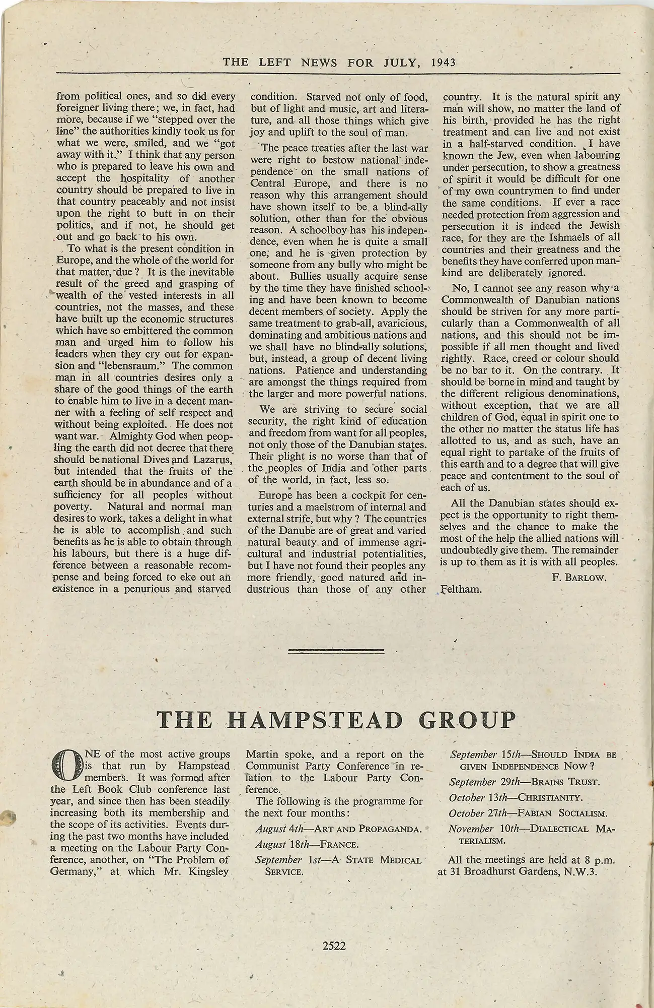 The ‘Three Musketeers’ – Strachey, Laski and Gollancz – worked tirelessly to fill the pages of The Left News, the LBC’s main vehicle for promotion and providing members with up-to-date information on Left wing and socialist happenings. Laski penned the lead article in this issue for July 1943, reporting that the recent Labour Party conference was ‘incoherent’ and debates held ‘ragged’. There were, however, positives such as the activities initiated by the Hampstead Group, one of over 250 LBC discussion groups formed across the UK by 1937. One wonders how many members turned up for the lecture on ‘Dialectal Materialism’ on 10 November.