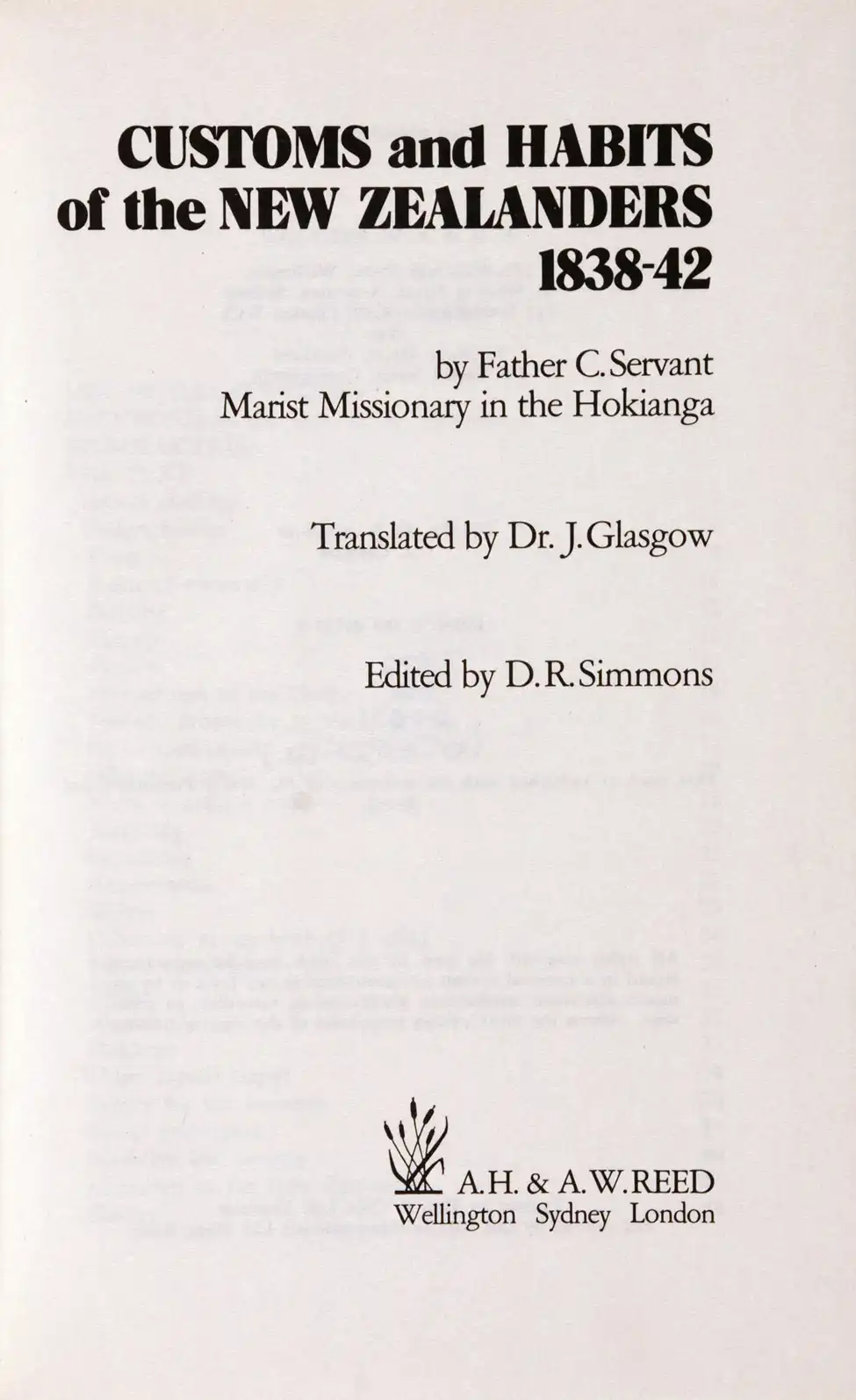 D. R. Simmons (ed.). Customs and Habits of the New Zealanders 1838–42 by Father C. Servant … Translated by Dr. J. Glasgow. Wellington: A. H. & A. W. Reed, 1973.