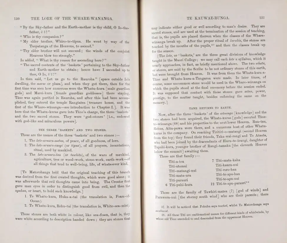 S. Percy Smith. The Lore of the Whare-wānanga; Teachings of the Maori College on Religion, Cosmogny, and History; Written Down by H. T. Whatahoro from the Teachings of Te Matorohanga and Nepia Pohuhu, Priests of the Whare-wānanga of the East Coast, New Zealand. New Plymouth: Printed for the [Polynesian] Society by Thomas Avery, 1913. Two parts, part one displayed.