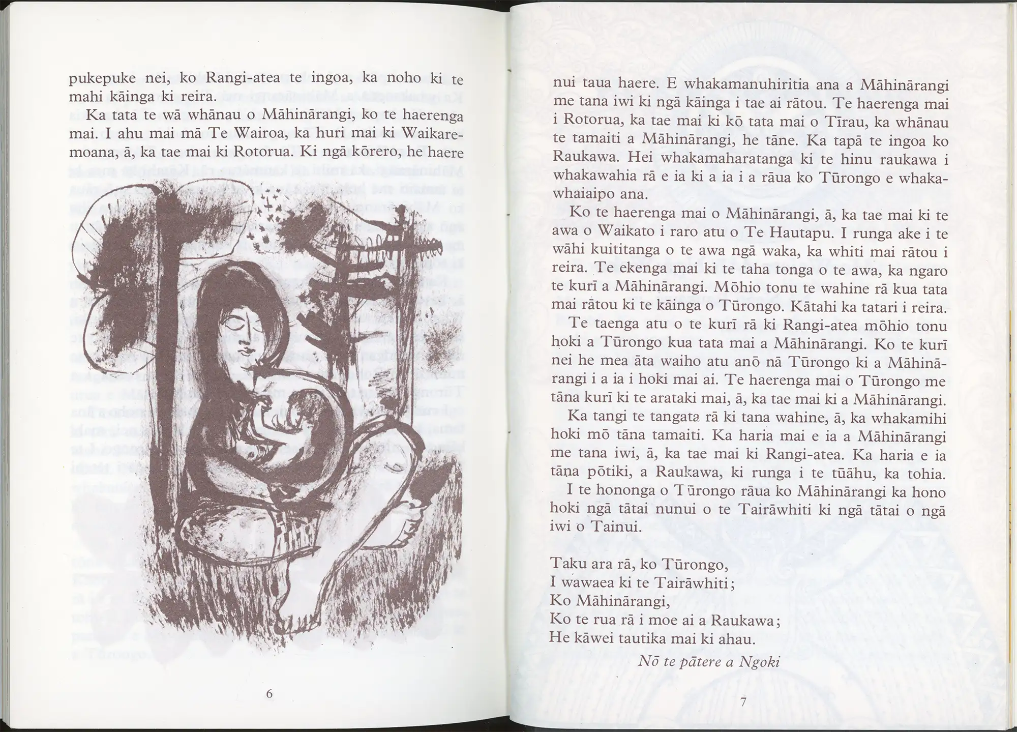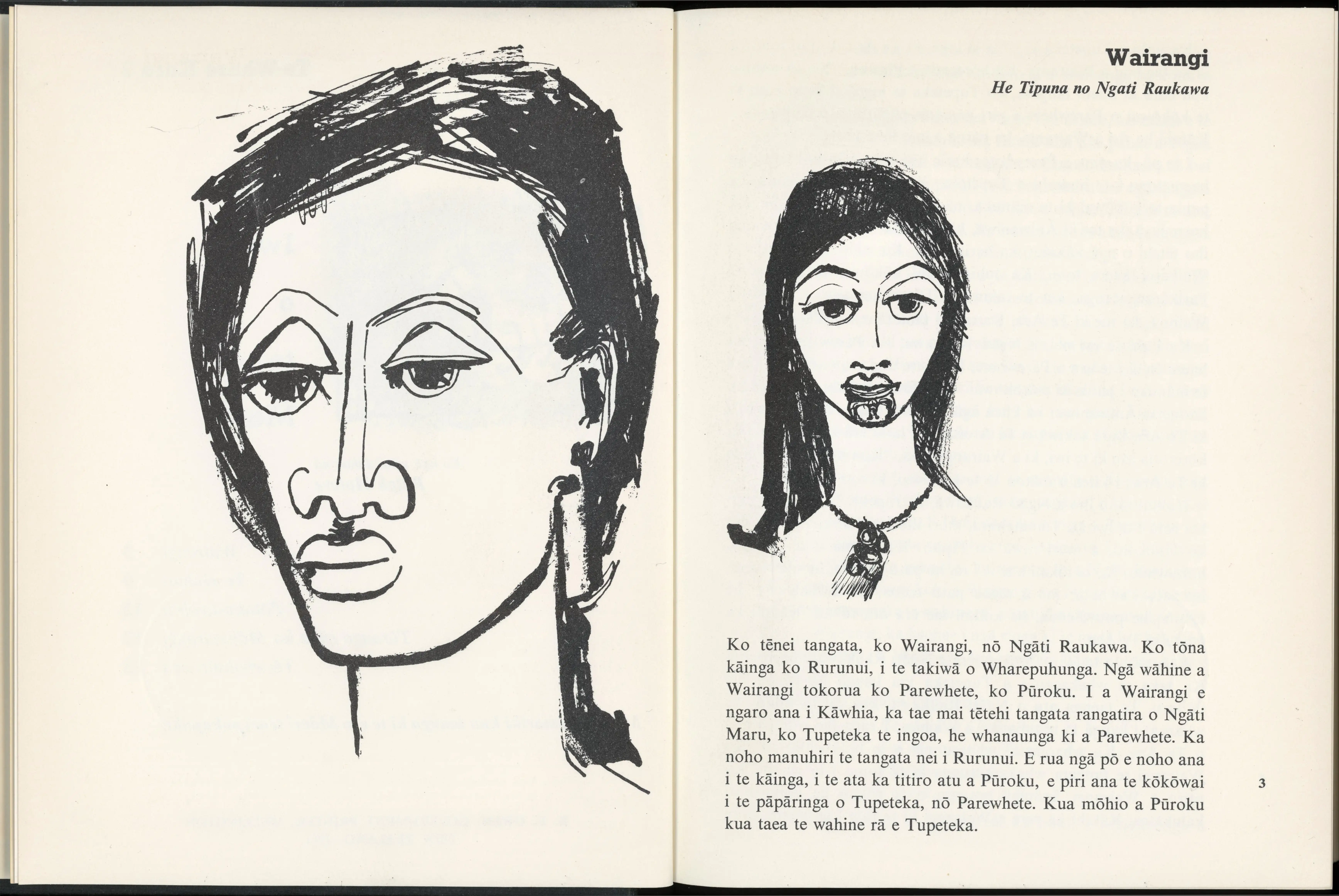 Between 1900 and 1960, the number of Māori fluent in te reo had decreased from 95 - 25%, a plight exacerbated by educational policies that diminished its importance. Educationalist and community leader Hoani Waititi (Te Whānau-ā-Apanui, 1926-1965) responded by creating the Te Rangatahi language series. Identifying the need for supplementary reading material to complement Te Rangatahi, he developed this Māori language school journal, which was designed to focus on perspectives and experiences familiar to Māori students. Through developing Te Wharekura, Waititi also enabled native speakers to become proficient writers of te reo Māori, helping the language to survive. The first issue of Te Wharekura was published by the School Publications Branch of the Department of Education in 1960. Learning Media = Te Pou Taki Kōrero published Te Wharekura from 1989 until its closure in 2013, at which point the journal was discontinued. It showcased some of Aotearoa’s most celebrated Māori writers and artists. Examples of artists’ illustrations are displayed in this case and the next.