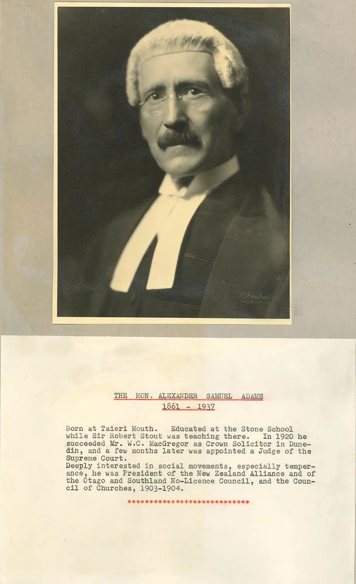 The Honourable Mr Justice Alexander Samuel Adams (1861-1937). Portrait photograph and brief typed biography. Open image in new window