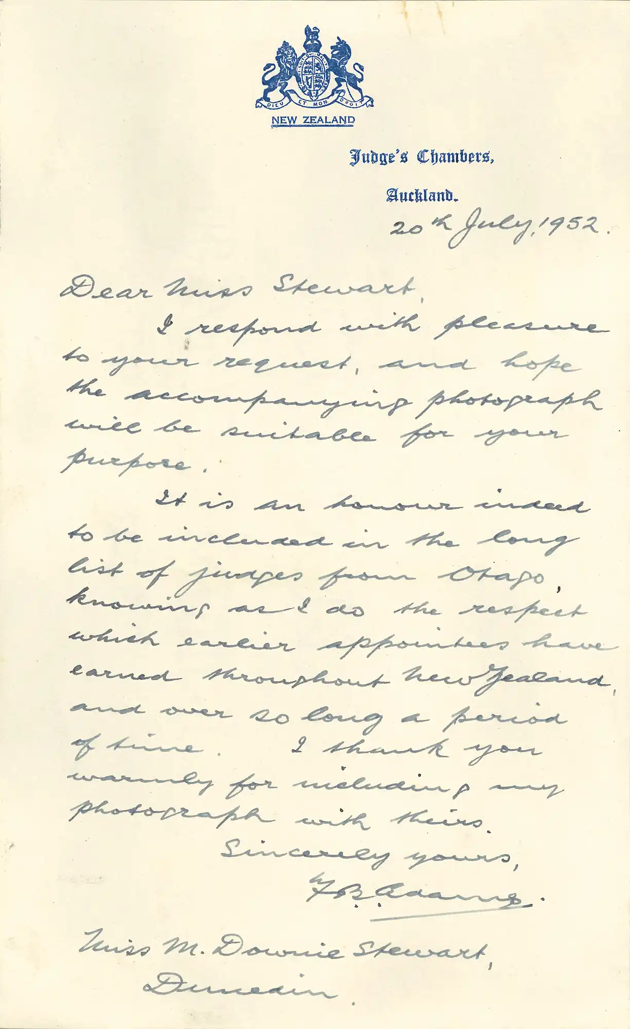 The Honourable Mr Justice Francis Boyd Adams (1888-1973). Letter from Adams to Miss Mary Downie Stewart, 20 July 1952, thanking her for invitation to be included in her collection. Open image in new window