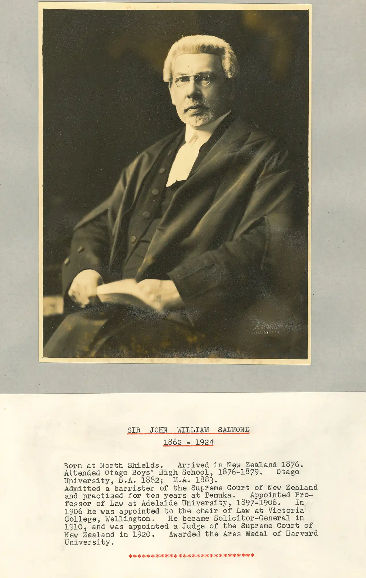 The Honourable Sir John William Salmond (1862-1924). Portrait photograph and brief typed biography.