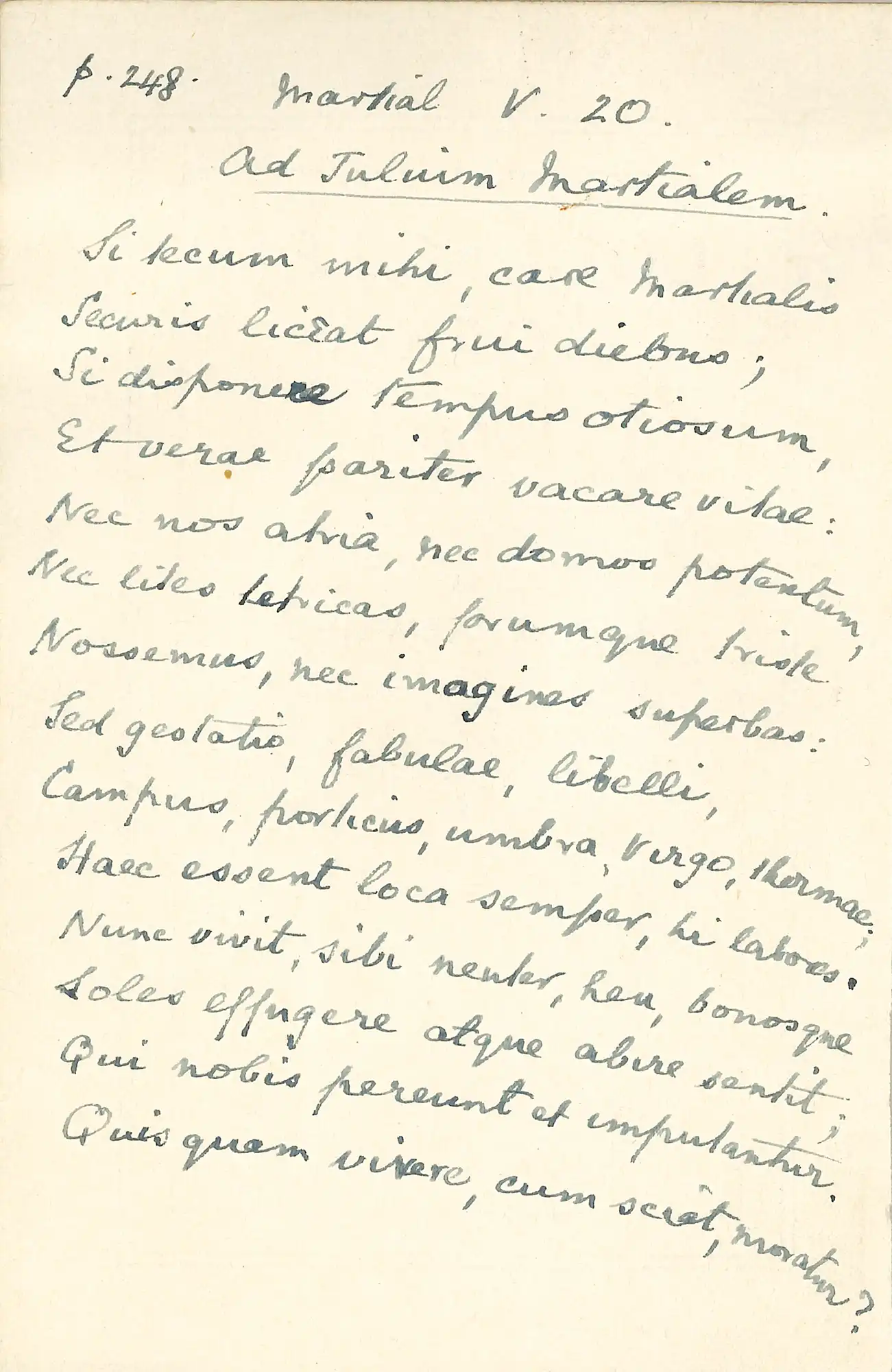 The Honourable Sir William Sim (1858-1928). Hand-written excerpt from Martial, v.20 Ad Julium Martialem.
