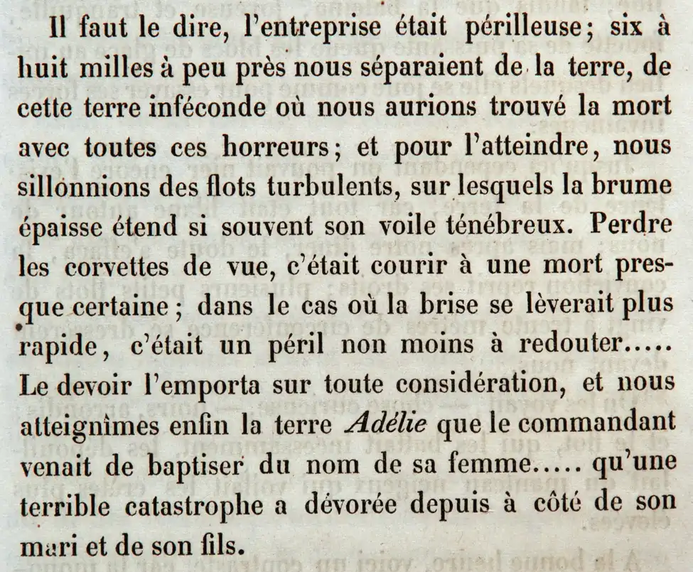 The British and Russians were not the only European powers seeking fame and wealth in the Antarctic region. France conducted its first Antarctic expedition in 1771–1772, which claimed vast territories but made no significant discoveries beyond the Kerguelen Islands. The 1837–1840 second French expedition, under Jules Dumont d’Urville (1790–1842), was far more successful. D’urville led the first experiments to try and determine the location of the south magnetic pole, gathered mineral and animal samples, and charted part of Antarctica’s coastal area, which he named the Adélie Coast after his wife (noted in the paragraph ‘Il faut le dire, l’entreprise était périlleuse’).