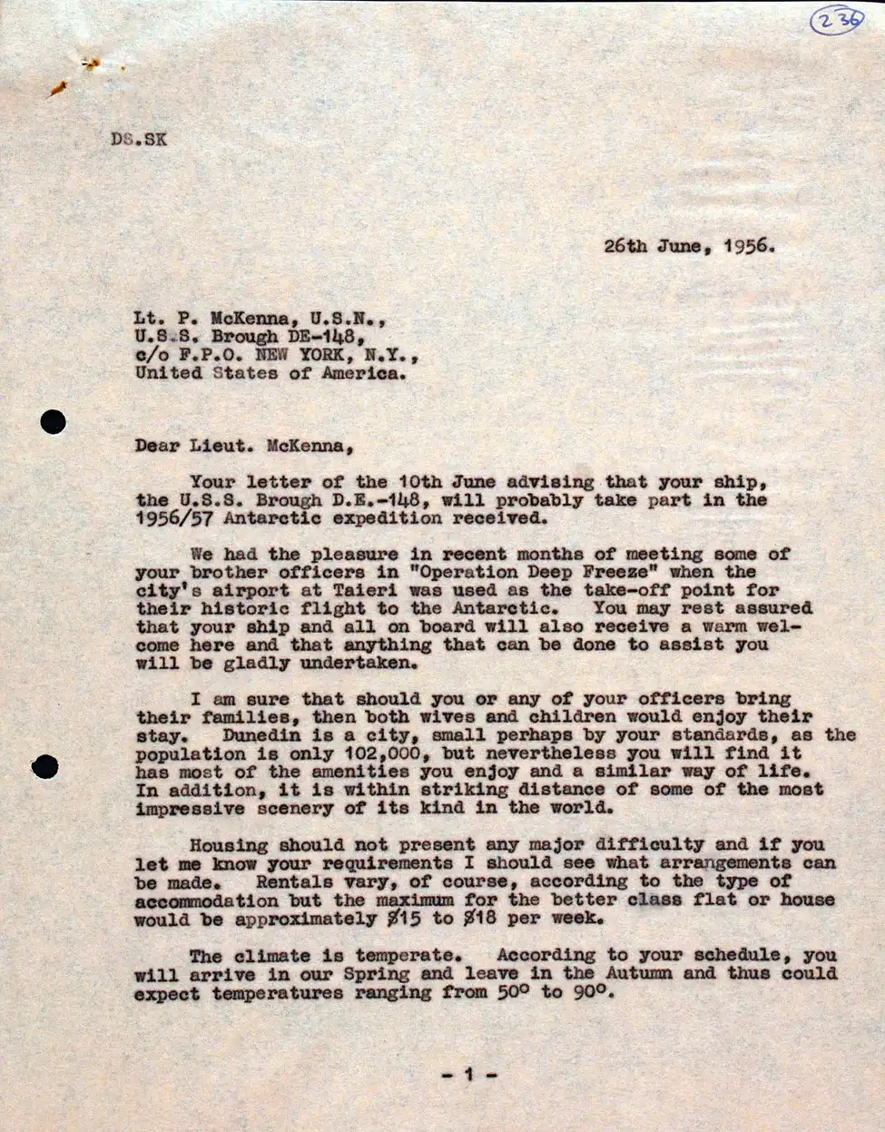 Letter. Lt. Patrick McKenna to the Mayor of Dunedin, U.S.S. Brough, New York, 10 June 1956.