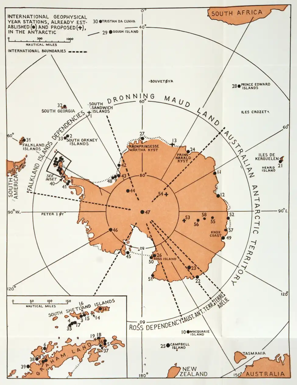G. C. L. (Colin) Bertram (1911–2001) was director of the Scott Polar Research Institute in Cambridge, UK, and William Evans Visiting Professor in Dunedin. A map, accompanying the pamphlet of his 1957 lecture series, shows scientific stations associated with the International Geophysical Year.