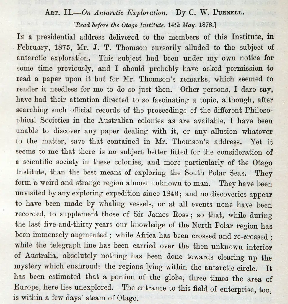 C. W. Purnell. ‘On Antarctic Exploration’ in Transactions and Proceedings of the New Zealand Institute 1878 Vol. XI, edited by James Hector. Wellington: Lyon & Blair, Printers, Lambton Quay, May 1879.