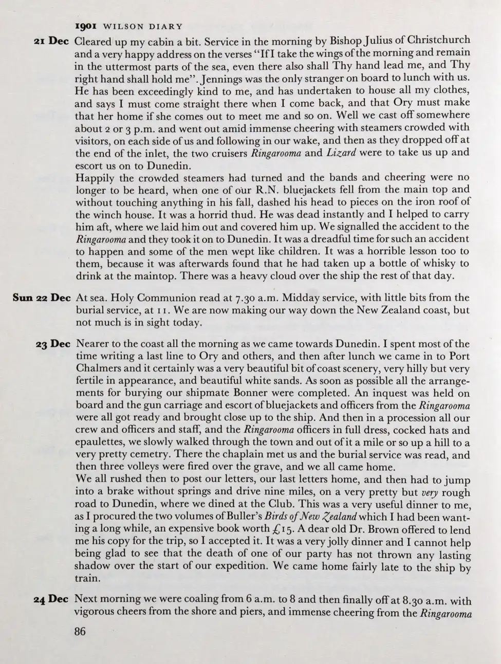 One of the members of the scientific staff present at the farewell dinner was Edward A. Wilson (1872–1912), who served as doctor, artist and vertebrate zoologist. A keen field naturalist, one of Wilson’s tasks was to examine and record the seals and birds of the region, and it was with delight that Wilson accepted a copy of Walter Buller’s Birds of New Zealand, loaned to him by Dr William Brown (a member of the Dunedin Club) for the voyage.
