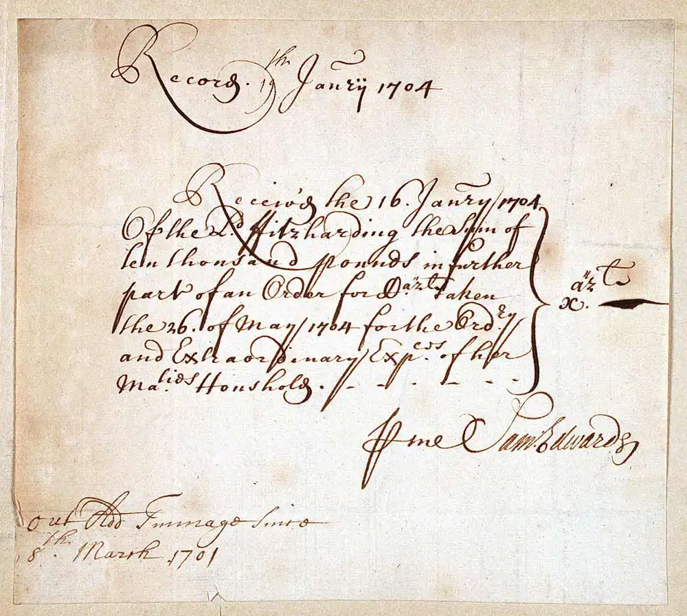 This note grants some insight into the cost of maintaining the royal household during the first years of Anne’s rule. What are deemed the ‘Ord[inary] and Extraordinary’ expenses total some £10,000, which would be in excess of £1 million in today’s currency.
