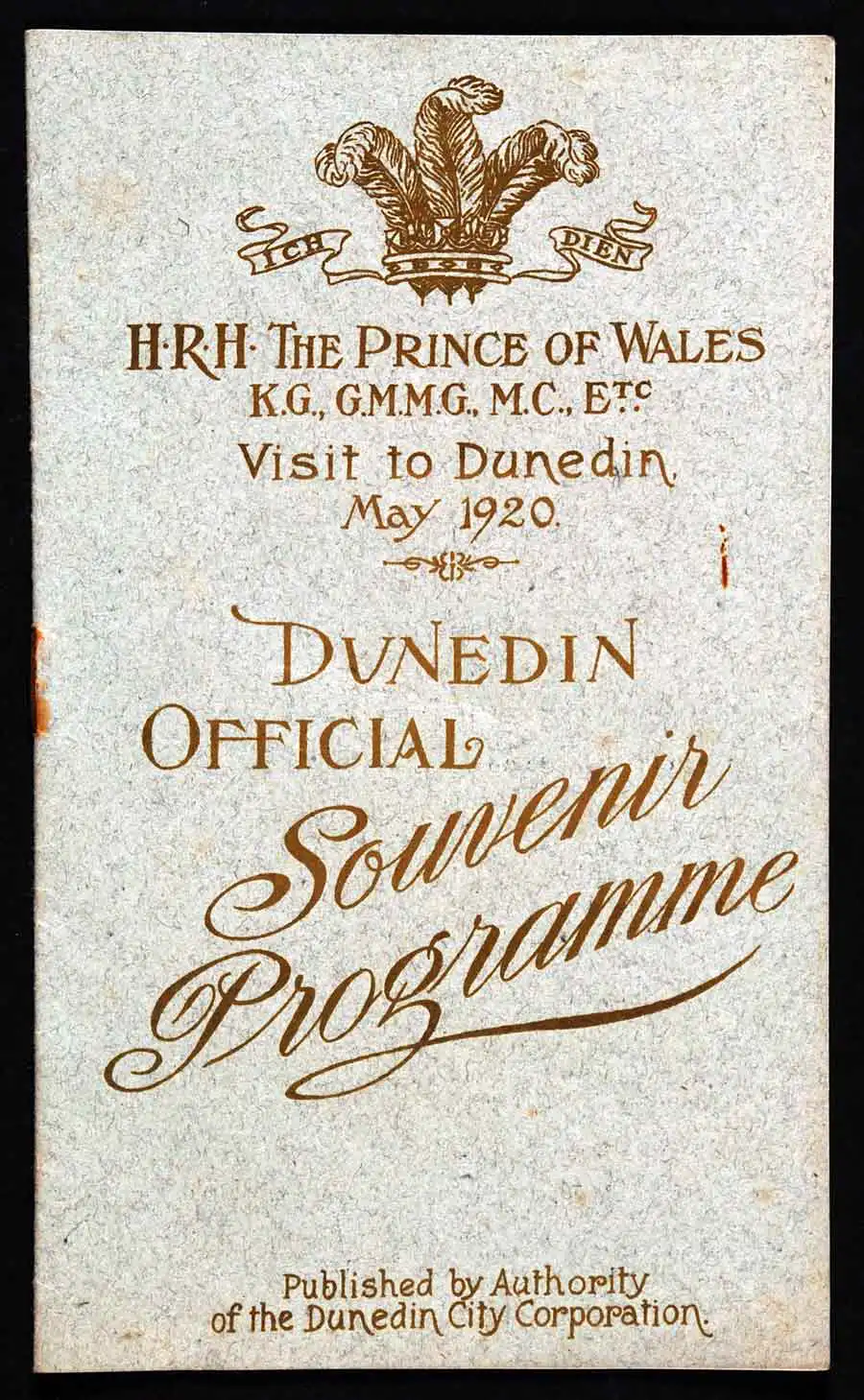 Official souvenir programme; H.R.H. the Prince of Wales … visit to Dunedin, May 1920. Dunedin: Dunedin City Corporation, printed by J. Wilkie & Co. Ltd., [1920].