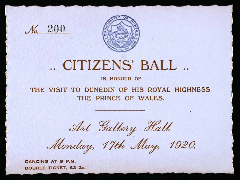 Invitation. ‘Citizens’ Ball in honour of the visit to Dunedin of His Royal Highness the Prince of Wales; Art Gallery Hall … 17th May, 1920’.