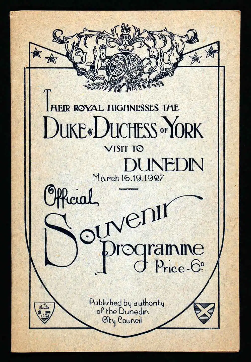 Official souvenir programme; Their Royal Highnesses the Duke and Duchess of York visit to Dunedin, March 16.19 1927. Dunedin: Dunedin City Council, printed by Otago Daily Times Print, [1927].