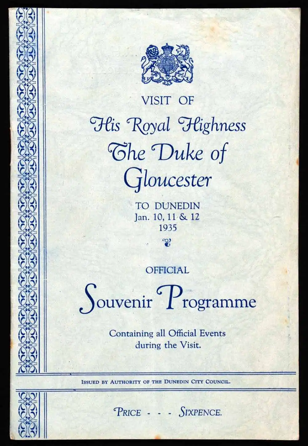 Official souvenir programme; visit of His Royal Highness the Duke of Gloucester to Dunedin, Jan. 10, 11 & 12 1935. Dunedin: Dunedin City Council, printed by Otago Daily Times Print, [1935].