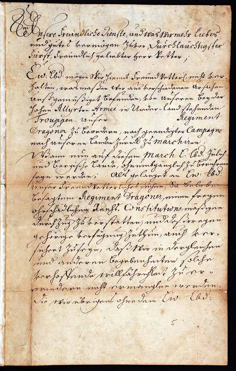 George was three years away from his accession to the British throne when he wrote this letter. It is addressed to his cousin Johann Wilhelm Pfalzgraf, Elector of the Palatinate and Palatine. George declares in the letter that he will order his troops (a regiment of Dragoons) back from the Netherlands to his own country, as soon as the campaign of the Allies in the Netherlands is finished, which presumably refers to the War of the Spanish Succession. Though the handwriting is difficult, it appears that George then requested permission for his regiment to move through the territories of Johann Wilhelm, referring to the Reichs-Constitution or constitutional rules of the Holy Roman Empire. The letter concludes with George informing Johann Wilhelm that he will grant similar permissions for Johann Wilhelm's troops in the same situation should the need arise.