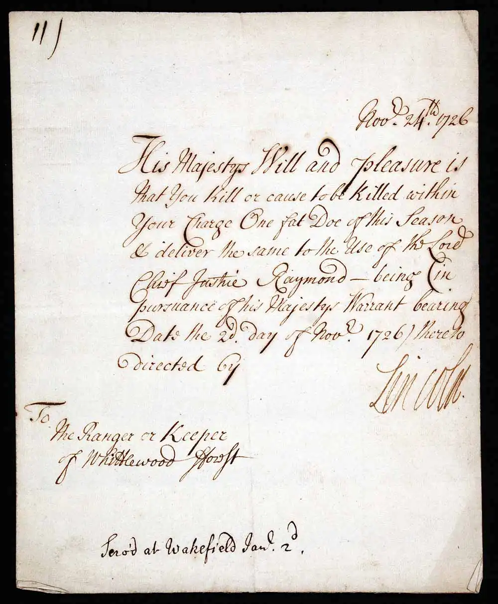 This royal warrant was issued less than a year before the death of George I. It charged the ranger or keeper with the task of killing ‘One fat Doe of the Season’, and delivering it to the Lord Chief Justice, who was then Sir Robert Raymond (1673–1733), later made 1st Baron Raymond during the reign of George II.