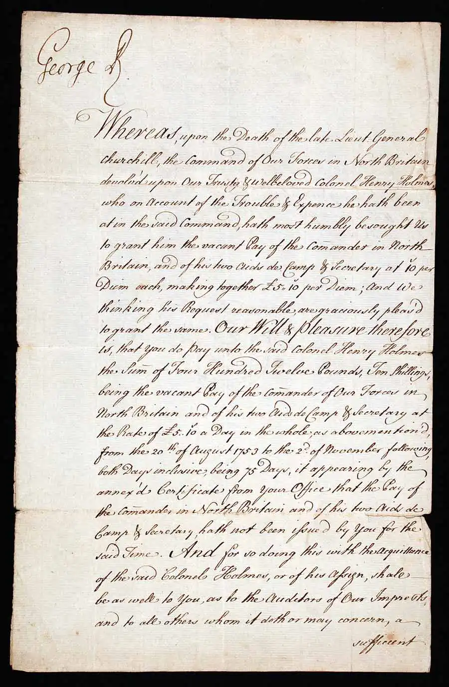 This royal warrant granted Colonel Henry Holmes (1703–1764) the vacant pay and of Lieutenant-General Charles Churchill (1679–1745), as well as the late officer’s command of the army in northern Britain. Holmes had won the favour of George II in 1746 by declaring his immediate readiness to the King while his fellow officers asked for a few weeks leave of absence before embarking on a military expedition. He remained a favourite of George II, who promoted Holmes to the rank of Major-General in 1756 and Lieutenant-General three years later.