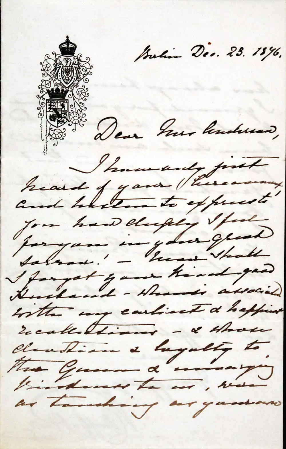 Letter signed. Empress Victoria, Consort of Frederick III (1840–1901), to Lucy Anderson (1797–1878), Berlin, 23 December 1876.