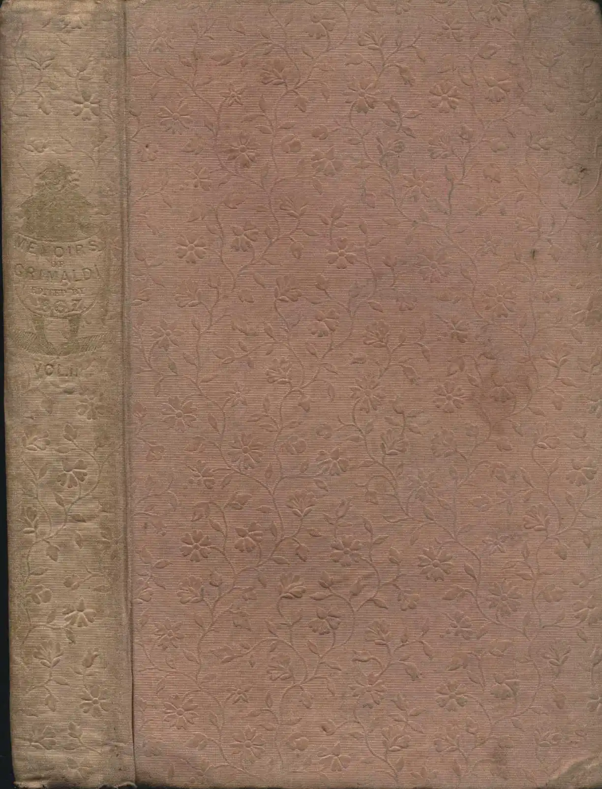This book is bound in pink cloth blind-blocked with a repeating floral design (probably with a ribbon embosser) and a fine background horizontal rib. The title is gold-blocked on the spine within a caricature of Grimaldi (a professional clown). The floral design extends over the edges of the book and into the pastedowns and may indicate that the cloth was not especially made for bookbinding. Diffuse repeating flower patterns were a common graining in the late 1830s; few examples exist after 1840.