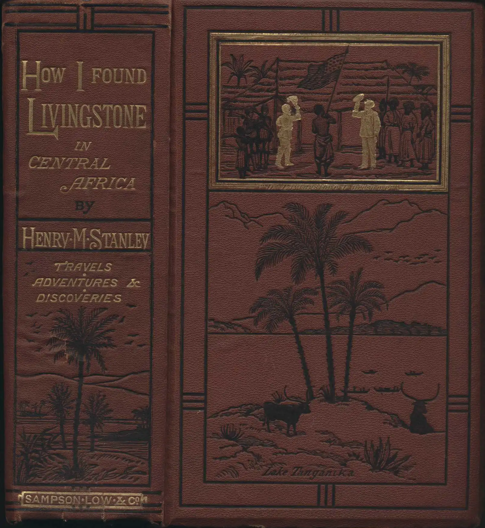Cloth-bound covers in general became increasingly pictorial during the 1870s, featuring onlays, vignettes, or blocked illustrations. The ‘Dr Livingstone I presume’ scene depicted here is based on an illustration within the book.