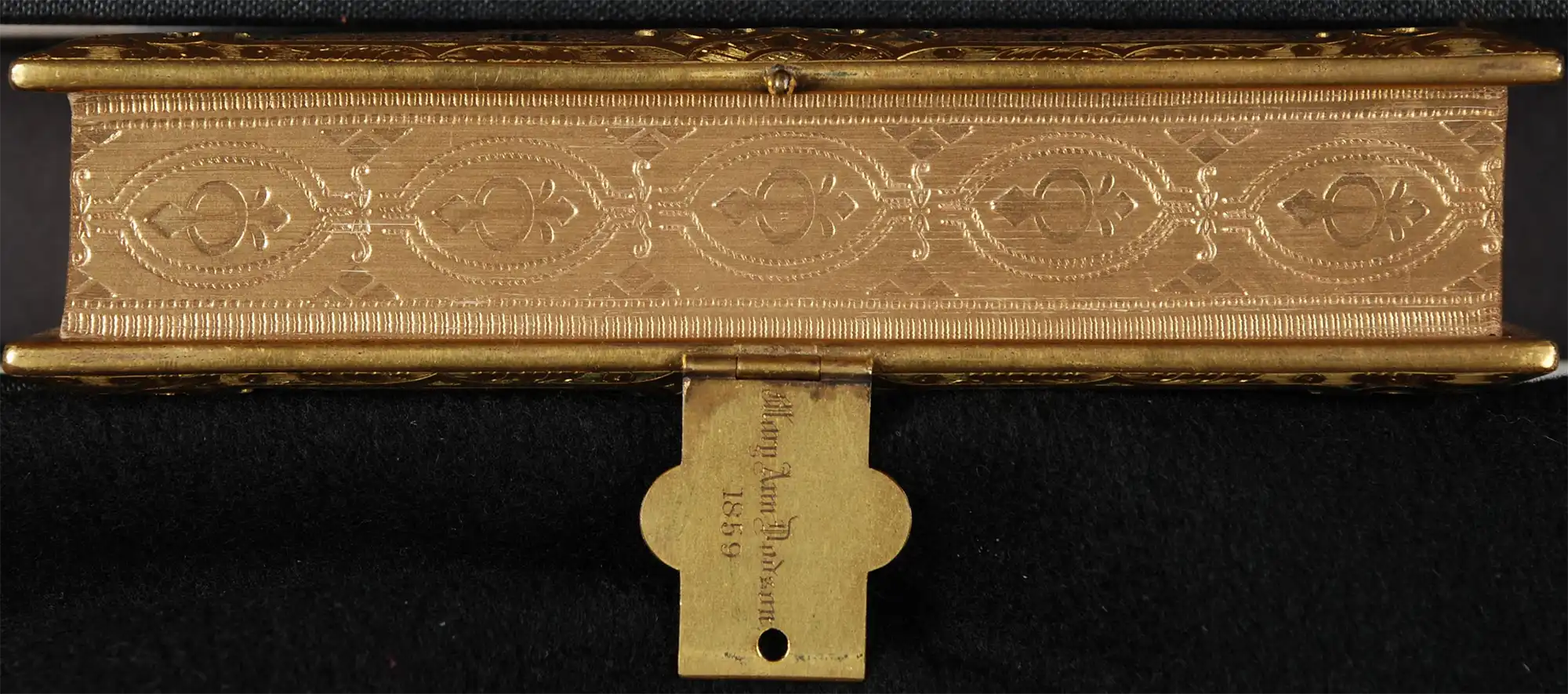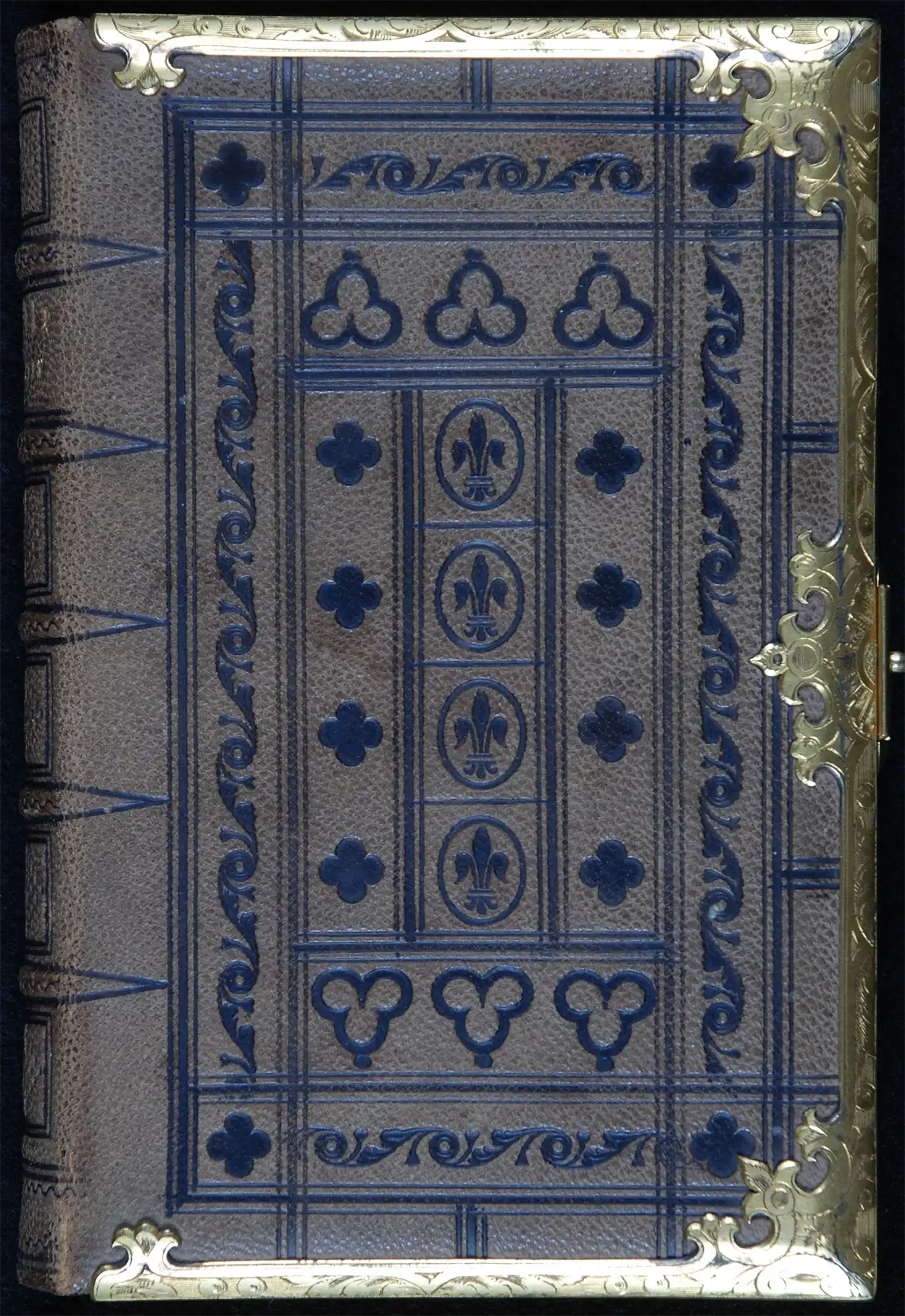 This Book of Common Prayer/English Bible is bound in mid-nineteenth century blind tooled brown morocco over wood; with ornate gilt clasp and frames, gauffered edges and decorated turn-ins. The inside face of the clasp bears an engraved inscription: Mary Ann Dodson, 1859. A presentation label to Dodson from her father is affixed to the front pastedown.