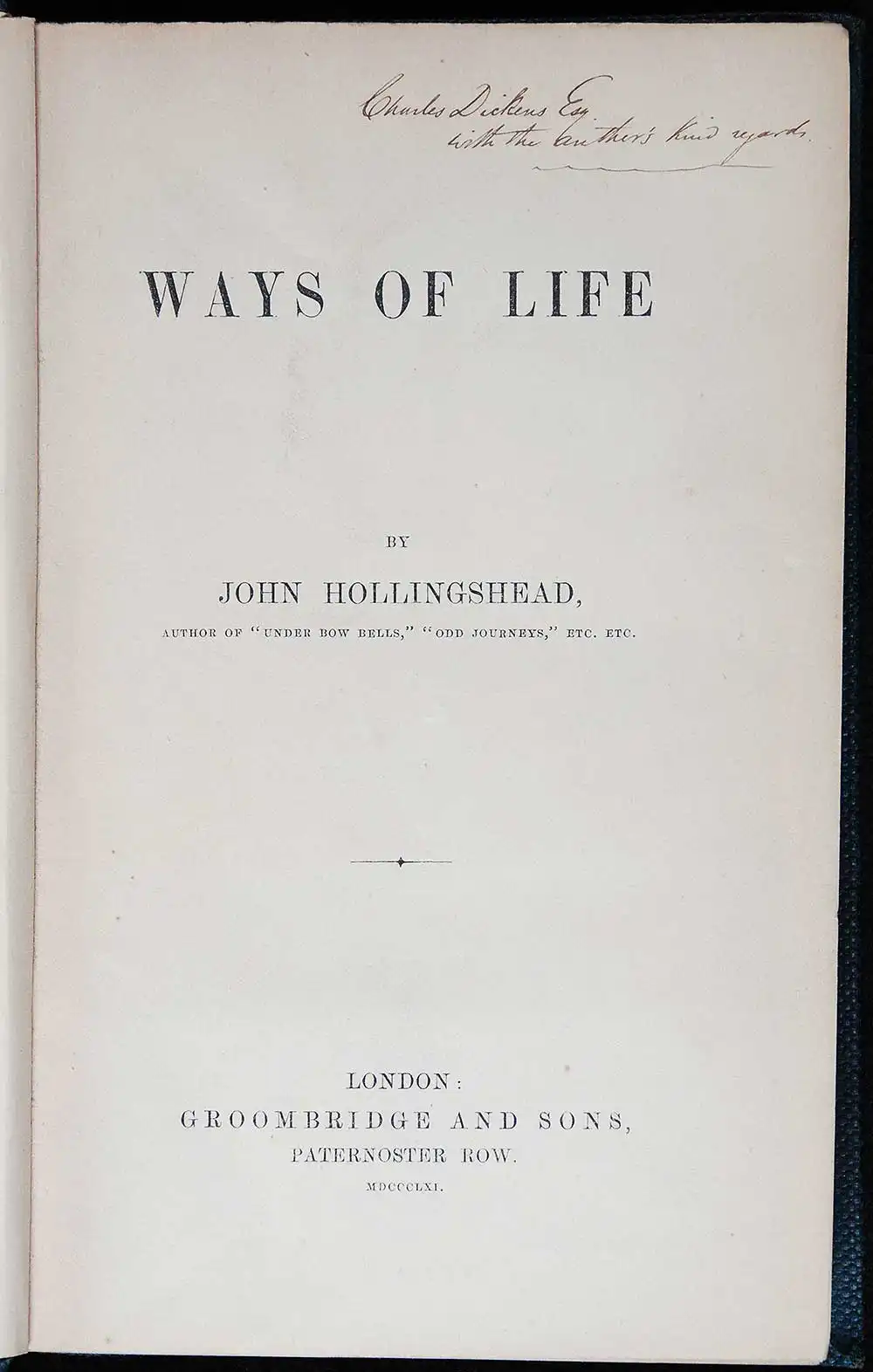 Another book from the library of Charles Dickens is John Hollingshead’s Ways of life which bears the author’s presentation inscription to Dickens.