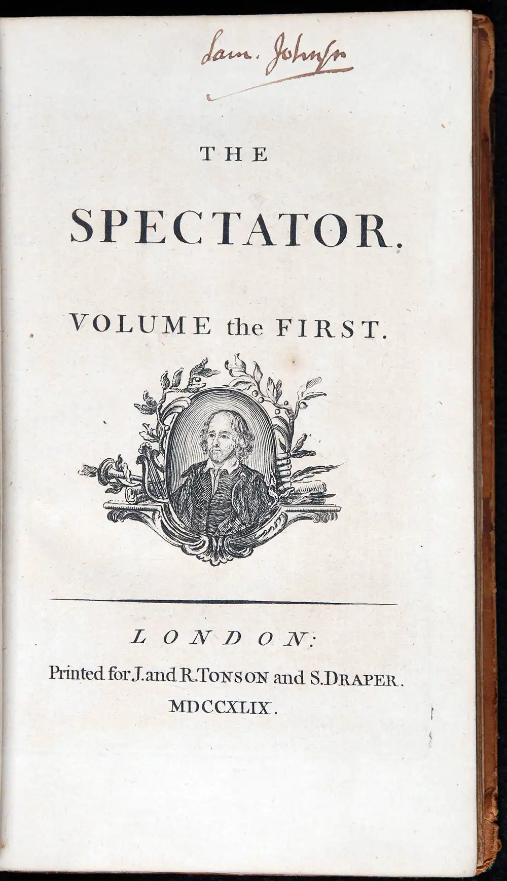 Joseph Addison and Richard Steele (editors). The spectator. London: Printed for J. and R. Tonson and S. Draper, 1749. Eight volumes; Vol. 1 displayed.