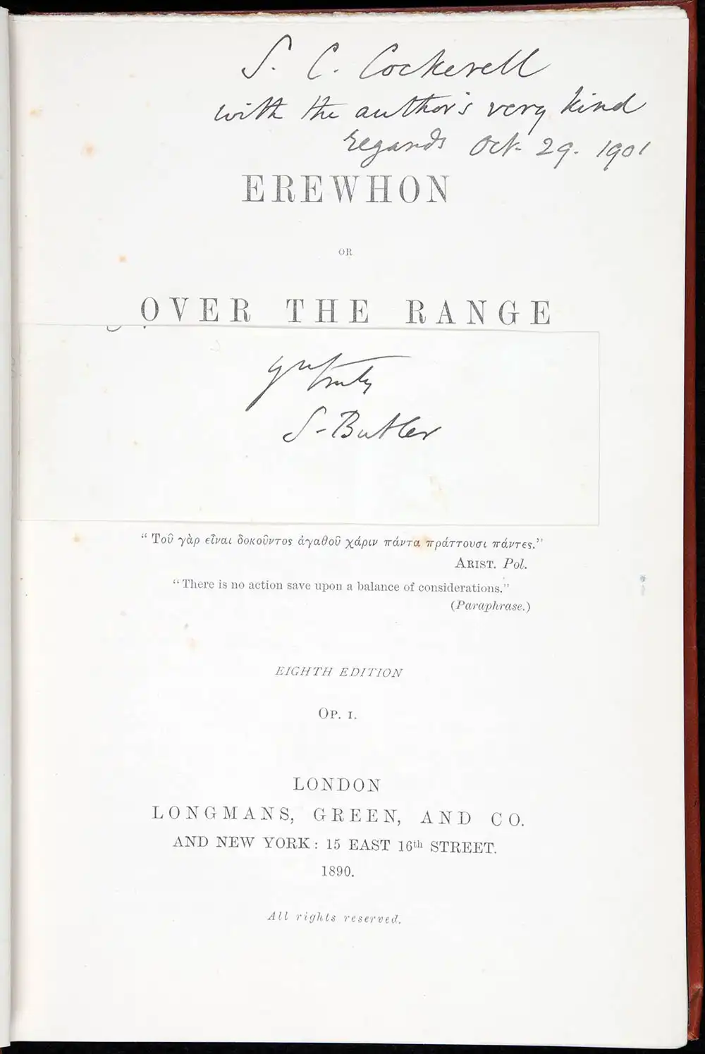 Samuel Butler. Erewhon, or, Over the range. 8th edition. London: Longmans, Green, 1890.