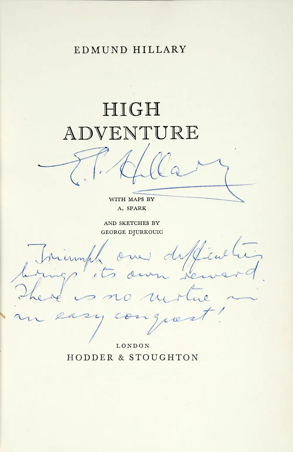 copy of the first edition of Edmund Hillary’s High adventure is autographed by the celebrated mountaineer, and