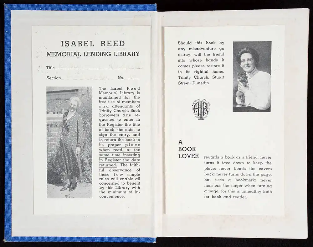 instructions for borrowing books, and two photographs of Isabel Reed.