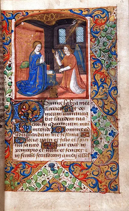 The open book, shown lying on a prie-dieu, is an iconographic interpretation of Mary as Sophia (Wisdom). It expresses the economic position of women book owners, and also represents Mary’s foreknowledge that her child is born to die (Apostolos–Cappadona 30). Placed between the figures is a jar, a sign of cleanliness, holding a lily, which is symbolic of purity and a signifier of the Virgin Mary.