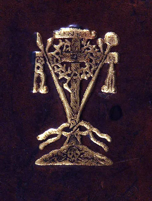Iconography is not limited to grand works of art and illustrated texts. The 33mm-high stamp present on the sixteenth-century binding of this Book of Hours is made of objects from the Arma Christi, or instruments used in Jesus Christ’s Passion.
