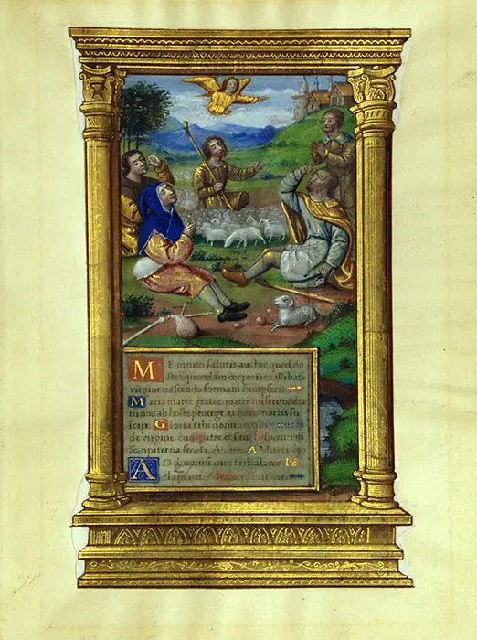 The shepherds are identified not only by their garb (and the fact that they are amongst a flock of sheep) but also by their bagpipes and crooks, or shepherd’s staves. The crook was employed by the Church as an insignia worn by bishops to indicate they are to attend to the faithful or ‘flock’. The solitary lamb is one of the symbols of Christ, and represents his sacrificial nature as referenced in John 1:29: ‘Behold the Lamb of God who takes away the sin of the world’.