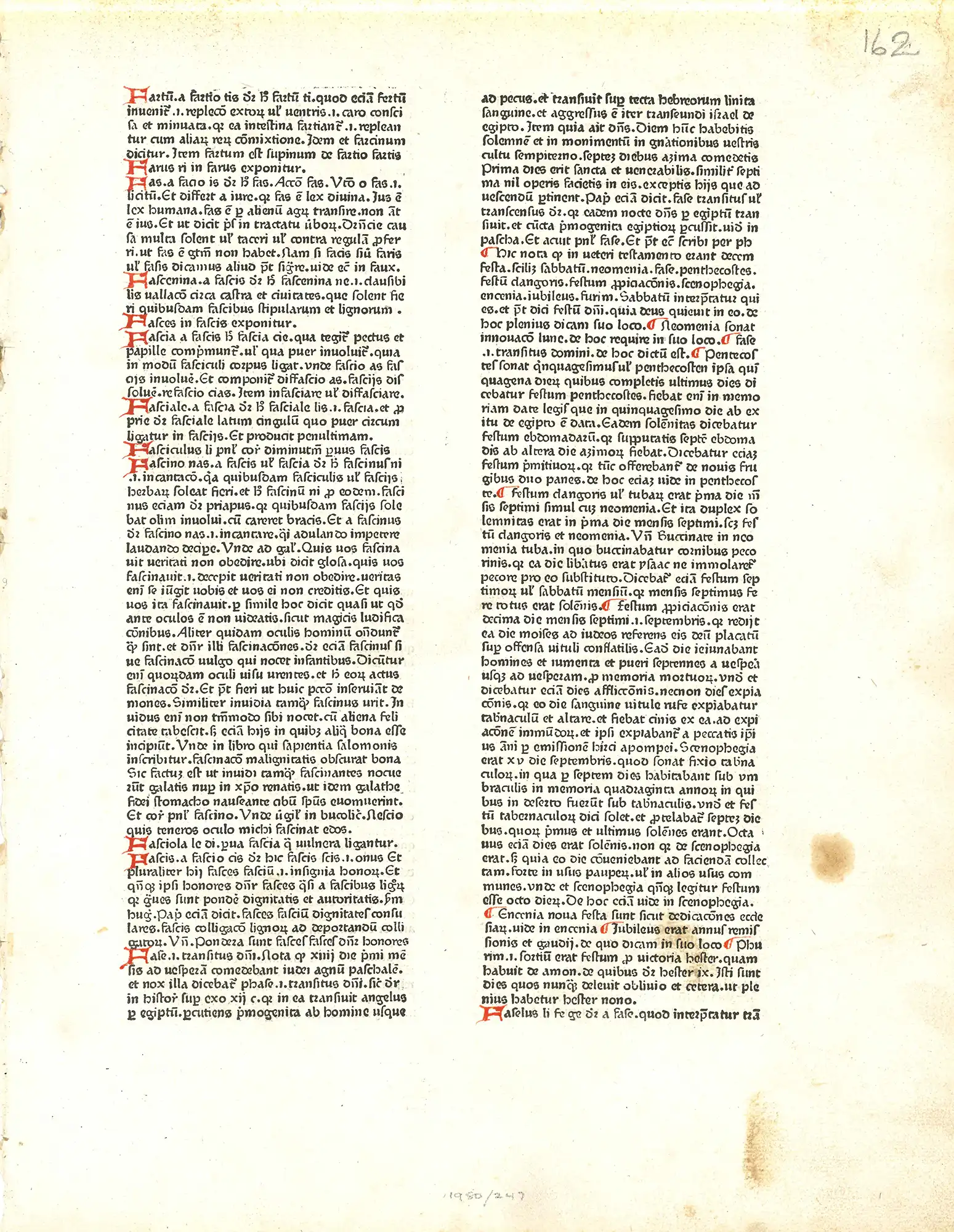 Giovanni Balbi. Catholicon. Latin. Mainz: [Johann Gutenberg?], 1460. Single leaf. Dictionary entries beginning recto "Fartu[m]" and ending verso "Fatuus".
