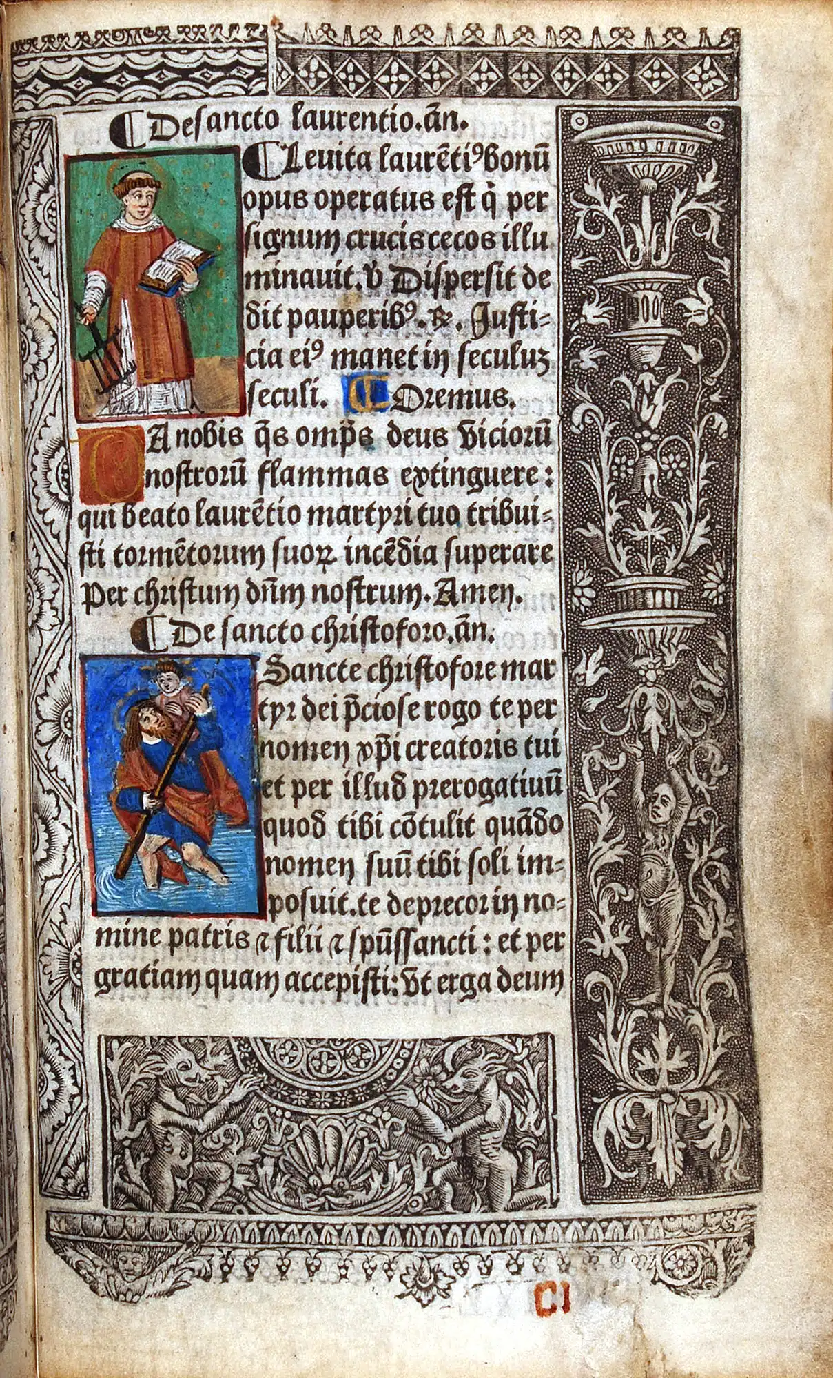 The earliest printed liturgical work held in the Reed Collection is this 1514 French Book of Hours. Printed on vellum, it is illustrated with historiated woodcut borders and decorated with hand-coloured printed 7-line miniatures. The book is open at the Suffrages of the Saints and the miniatures depict Saints Laurence, Stephen, and Christopher.