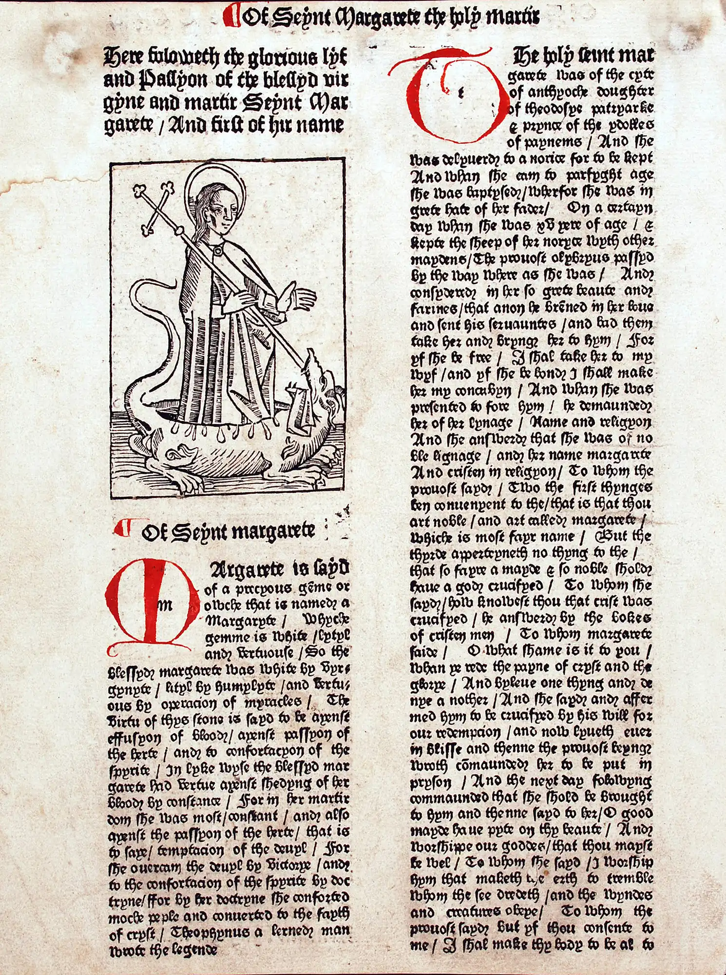 Jacobus de Voragine. Legenda aurea. Westminster: William Caxton, ca. 1483. Single leaf. Text is from the Life of Saint Kenelm and Saint Margaret the Holy Martyr.