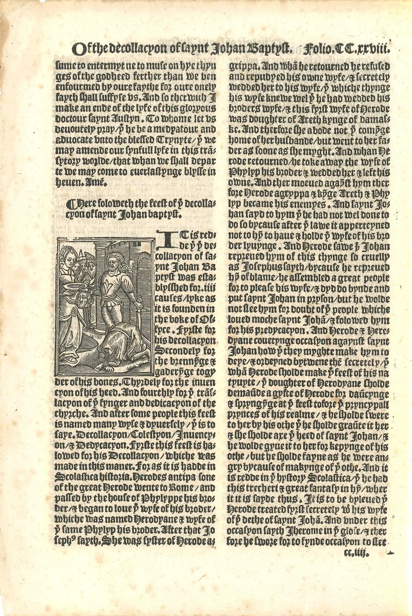 Jacobus de Voragine. Legenda aurea. London: Wynkyn de Worde, 1521. Single leaf. Text is from Of the decollacyon of saynt Johan Baptyst.
