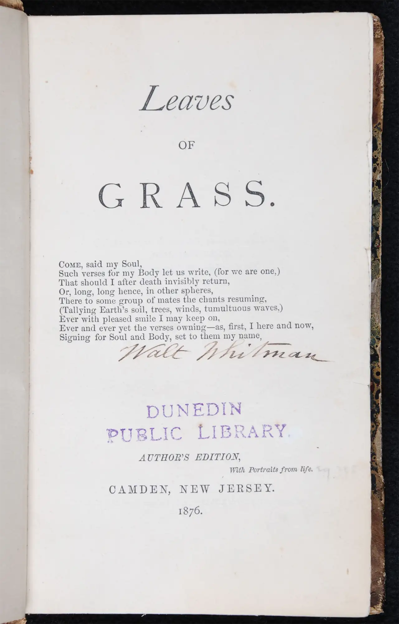 Whitman reissued Leaves of Grass in 1876 to celebrate the centennial of the United States. He made innovations in this printing, both by splitting off previously annexed and new material into a companion volume, Two Rivulets, and through alterations to the title page and intercalations in the text. Whitman signed the title page of each copy, making this the first time his name had appeared on the title page of Leaves of Grass (albeit not in type).
