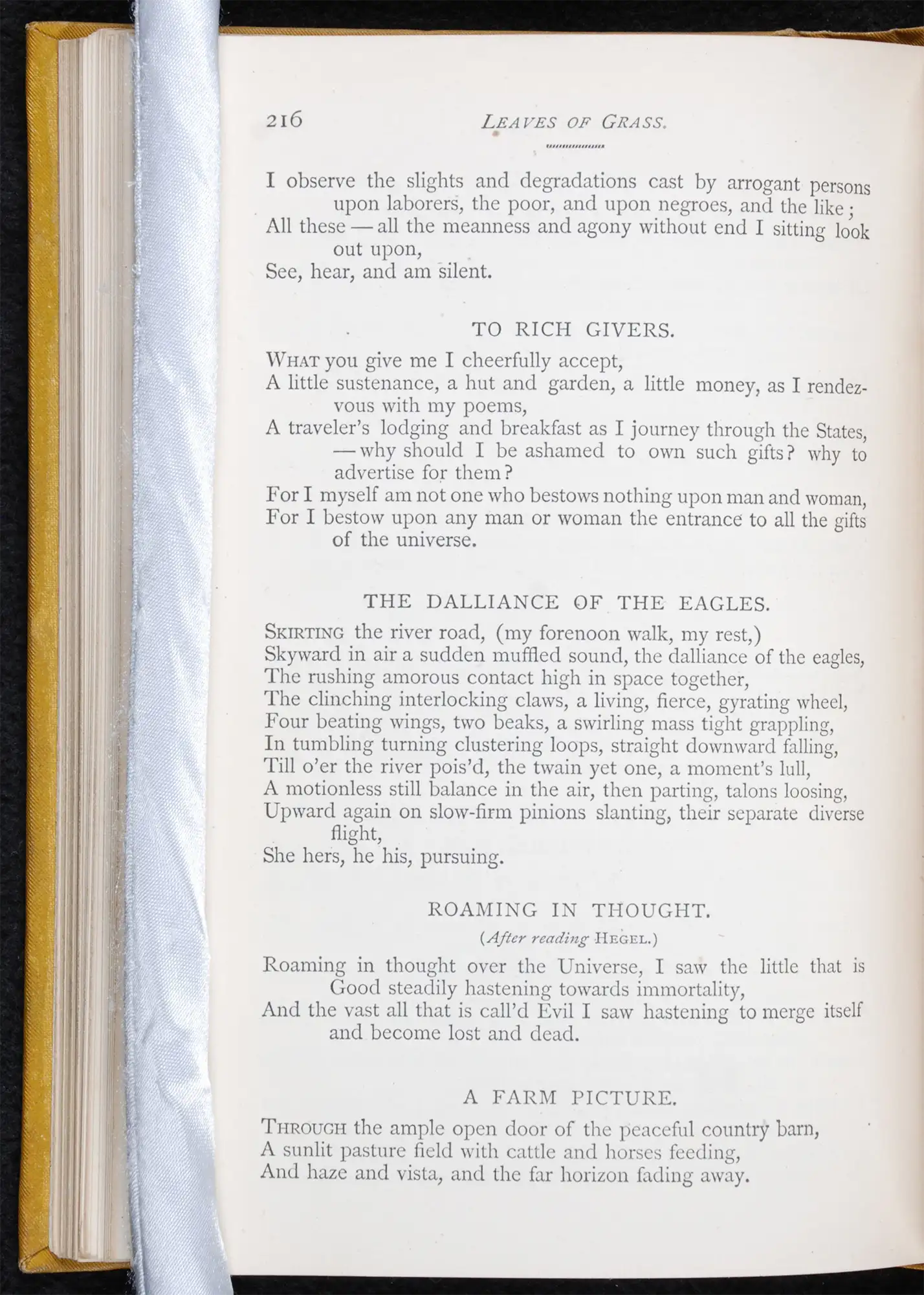 As well as adding new poems to each successive edition of Leaves of Grass, Whitman rewrote and rearranged many previously published sections. The displayed poem ‘I Sing the Body Electric’ is a well-known example.