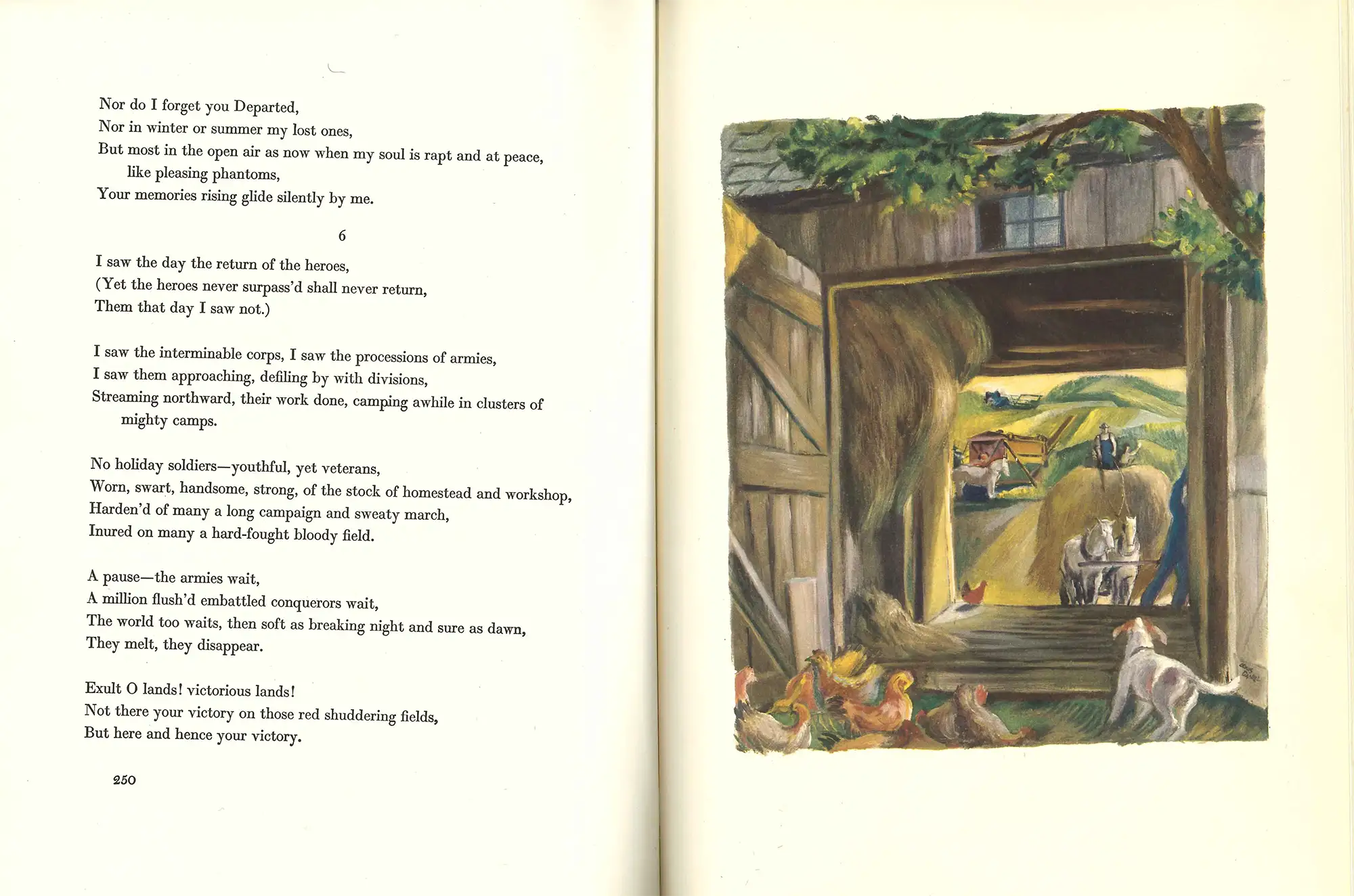 This illustrated version of Leaves of Grass is open at ‘The Return of the Heroes’, one of several poems Whitman wrote about the aftermath of the Civil War. A memorial to the dead, the poem also praises the technological advances being made in agriculture and industry.