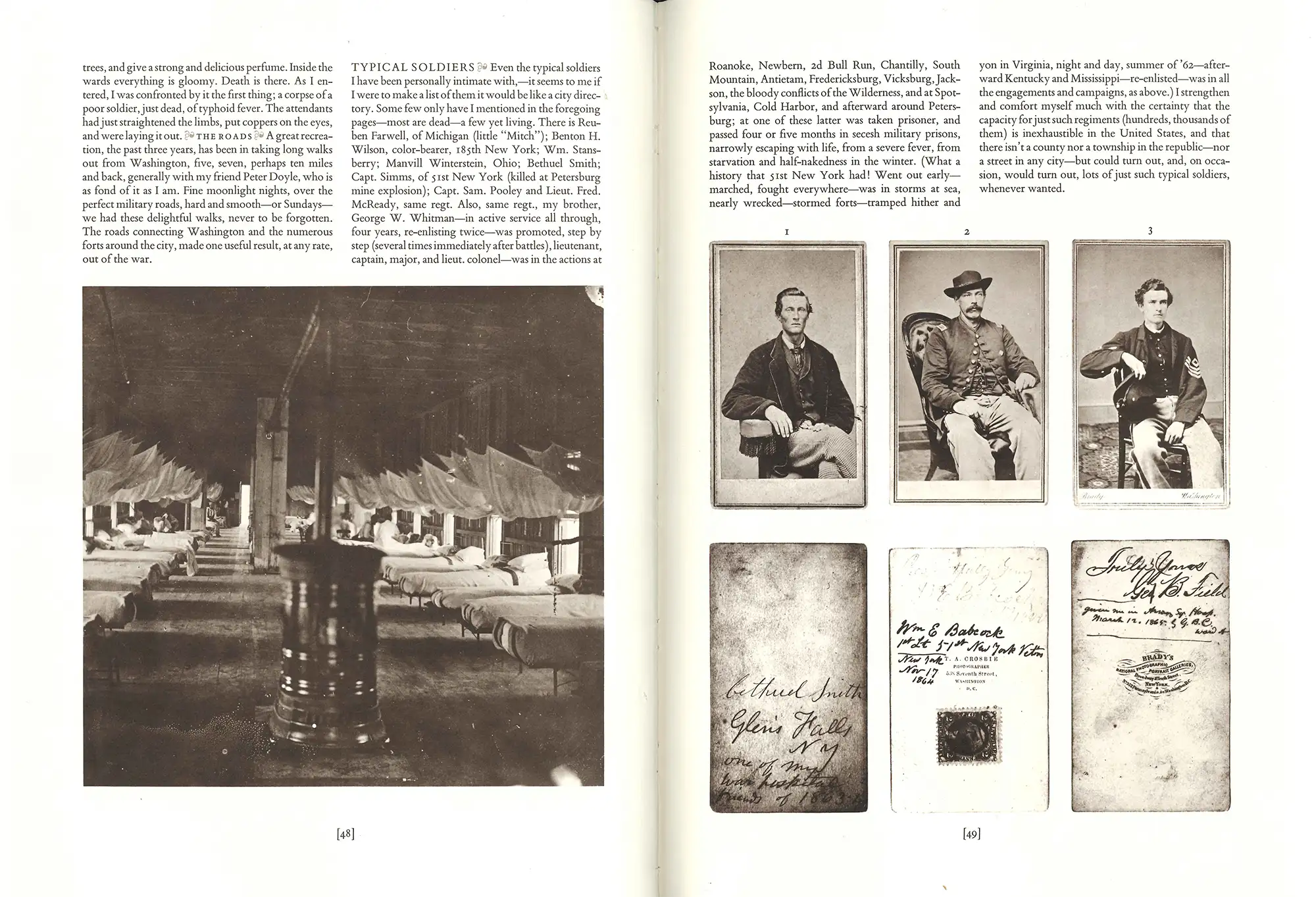 The displayed pages contain Whitman’s account of ‘Typical Soldiers’. Whitman befriended scores of convalescent soldiers during the war years. He mentions one of his brothers, George Washington Whitman (1829-1901), who was involved in several major Civil War conflicts.