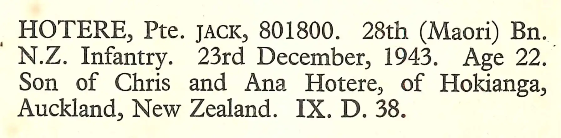 Detail of entry for Private Jack Hotere, 28th Maori Battalion, from The war dead of the British Commonwealth and Empire…Sangro River War Cemetery Part II. London: The Commission, 1955. SPRH 940.53 WAR